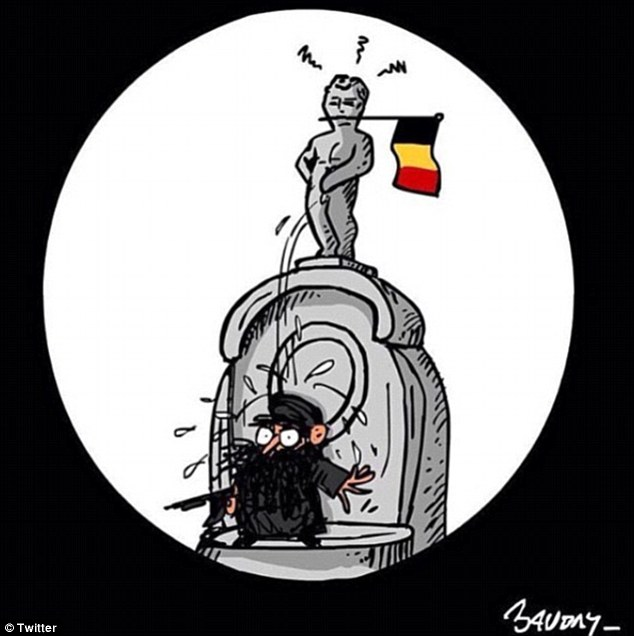 众所周知,“撒尿小童”(Manneken Pis)是布鲁塞尔广场的标志性建筑,也是游客必游的景点。有网友就借此制作漫画,展示对恐怖主义的藐视。