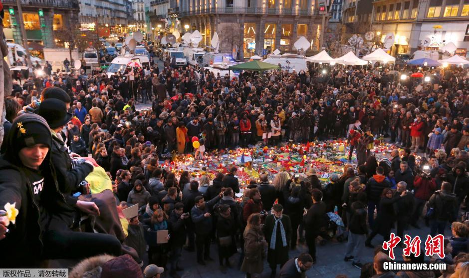 在布鲁塞尔古老的证券交易所外,当地民众继续为恐袭遇难者默哀。