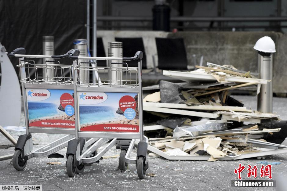航站楼内的手推车和爆炸残骸。