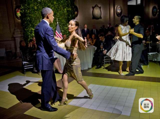 据悉,当晚奥巴马受阿根廷总统马克里邀请,在位于首都布宜诺斯艾利斯的基什内尔文化中心出席国宴。席间,一名为远道而来的客人表演探戈的女性舞者突然出现在奥巴马面前,邀请他和自己共舞一曲。