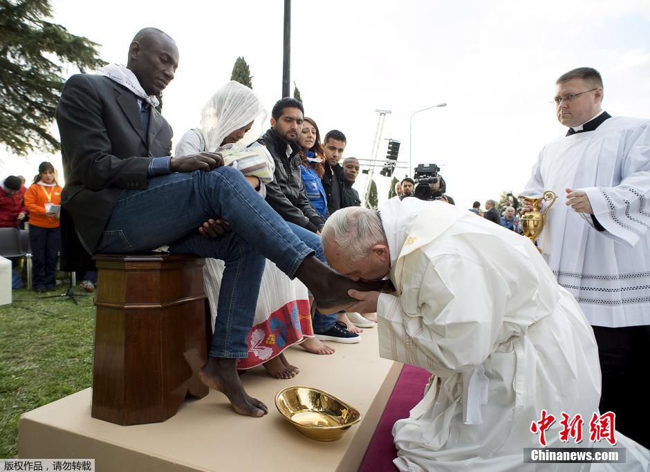 教皇方济各走访难民营 为难民洗脚并亲吻脚背(组图)