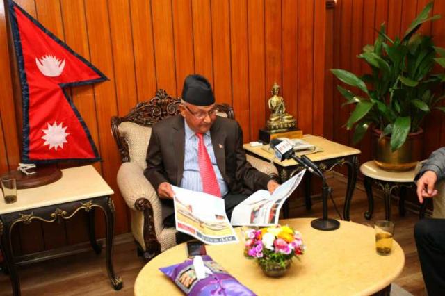 尼泊尔总理奥利阅读亚太日报尼泊尔子报。周盛平摄