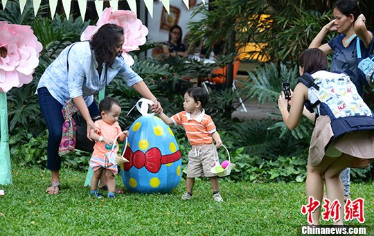 图为家长们带着孩子捡拾彩蛋。 中新社记者 张明 摄