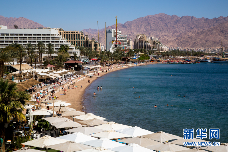 埃拉特北部海湾的众多酒店和游客。濒临红海亚喀巴湾的埃拉特,是以色列最南端的城市。埃拉特人口约5万人,面积84平方公里,位于三国交界处,与埃及的塔巴和约旦的亚喀巴接壤,是以色列著名的红海度假胜地。这里终年阳光普照,冬春季节气候尤其温暖宜人,美丽的海滩、完善的旅游设施,吸引了众多游客和各类水上运动爱好者。新华网记者杨志望摄