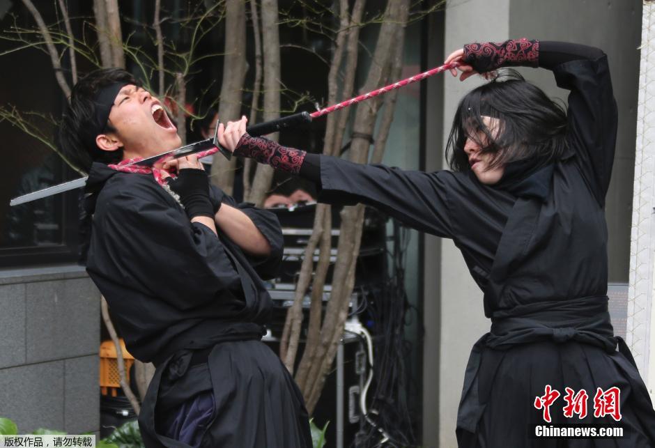 当地时间3月26日,日本伊贺忍者成员“阿修罗”在东京樱花季上表演功夫,以此吸引游客前往参观。
