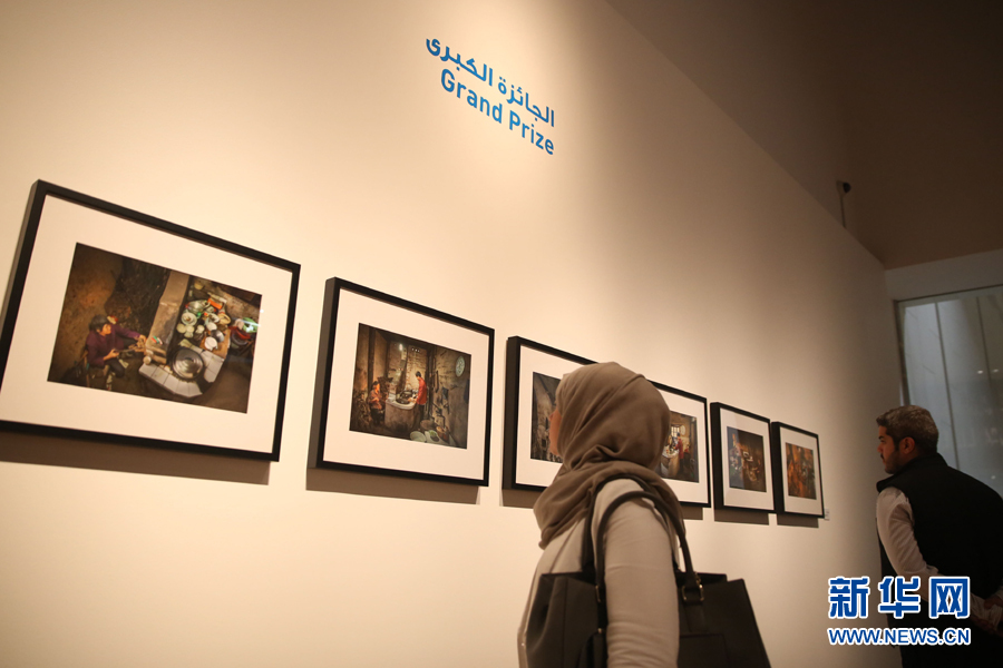 2016年第九届“阿联酋国际摄影大赛”获奖作品展28日在阿布扎比萨阿迪亚特岛“灯塔”艺术中心开幕。中国摄影师刘乘良以中国农村家庭厨房为题材的8幅作品《灶台情》获得本届大赛最高奖项,赢得国际摄影艺术联合会金牌和10万迪拉姆(约合17万元人民币)的奖金。图为参观者在欣赏刘乘良的摄影照片《灶台情》。新华网记者安江摄