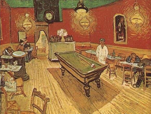在布面油画《夜晚的咖啡馆》中,梵高利用其典型的粗糙笔触和大胆的色彩描绘了一家咖啡馆的内景,里面有一张桌球台,顾客四散的坐在各处。(编译/张琳)