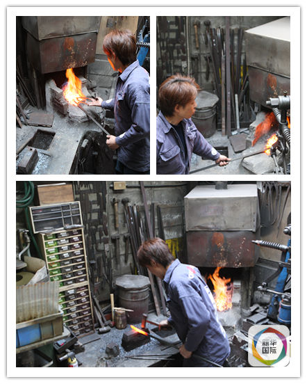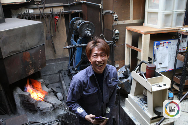 从火炉用钳子夹出烧得通红的钢块,山田佳孝娴熟地抡起铁锤锻打起来,火花四溅,但山田却未穿戴任何防护。“打刀20多年,我知道火花怎么飞溅,一点也不怕,”看到退后躲避的记者,山田笑着说。