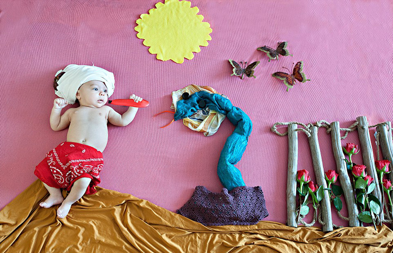 英摄影师内利·普拉霍瓦(Neli Prahova)用一些布料布置出了各种阿拉伯神话中的场景,拍摄了一组婴儿在阿拉伯神话中玩耍的照片,深受大家喜爱。