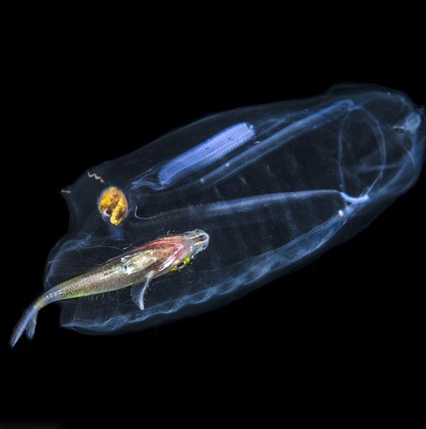据英国《每日邮报》3月30日报道,美国佛罗里达州的韦恩潜入150多米深的海底拍摄了一组照片,照片中的半透明海洋生物腹中竟有一条彩色小鱼。