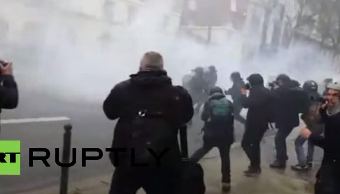 游行队伍高喊“中学生、大学生、失业者、从业者,都应该一起战斗”或者“大家一起罢工”等口号。图为冲突画面。