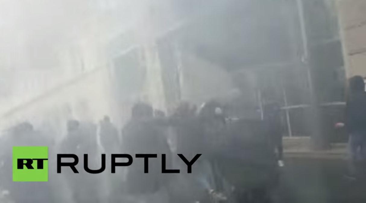 当地警察局表示,游行队伍数次停止前进,一些激进分子爬上路边停放的车辆。图为冲突画面。