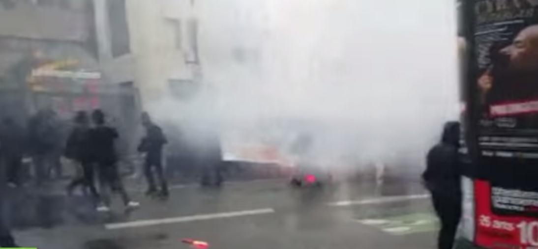 据悉,游行队伍经过的公共汽车候车亭、专卖店的橱窗以及市政设施都遭到破坏,不少商铺拉下卷帘门防止店面损毁。图为冲突画面。