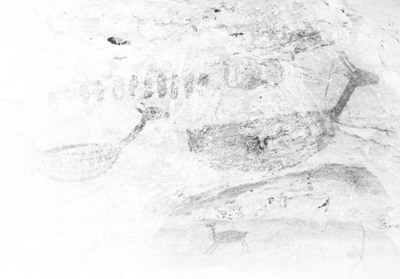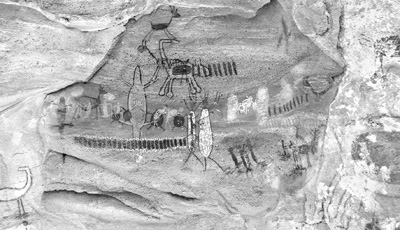 是什么原因促使数万年前的人们在日常捕猎采集之余大费周章地在岩壁上作画呢?在文字尚未出现的时代,岩画是人类沟通交流、传递信息的主要方式。他们试图通过一幅幅画作记录日常生活——捕猎、战斗、与子女嬉戏、举行某项仪式,等等。于是今天的我们可以在岩画中看到:一位母亲将孩子抛起嬉戏,一对恋人微微探身轻轻一吻,一家人在仰望并试图碰触头上的星空……动物是岩画的另一个主角,比如巨型犰狳、马鹿、螃蟹等。在许多画面中,人们手持长矛,追逐着前方的猎物,由此可以推断,此时的人类借由工具——比如长矛——已经居于食物链的顶端。