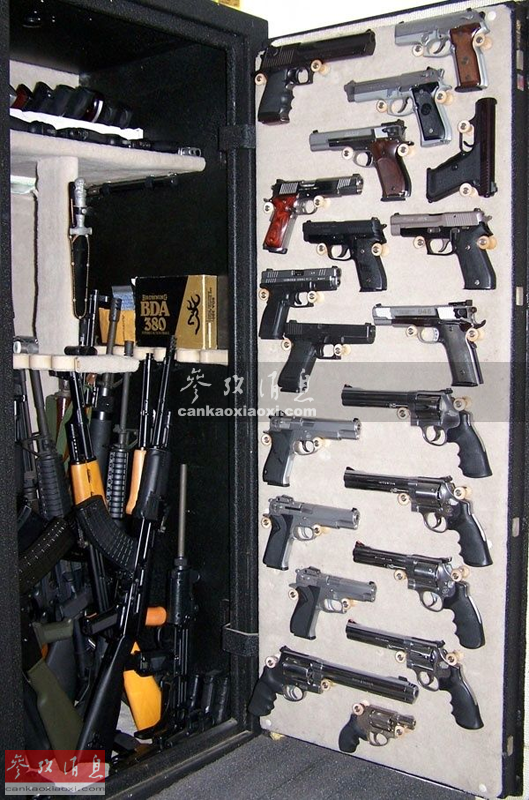 这位的枪柜比上面那位还夸张,从普通自动手枪(M1911、格洛克、M92等)、转轮手枪(柯尔特、史密斯威森)到突击步枪(AK-47、M4等),甚至还有把乌兹冲锋枪,均有收藏。