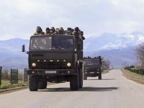 卡车运载着亚美尼亚志愿者,向冲突地区驶去。