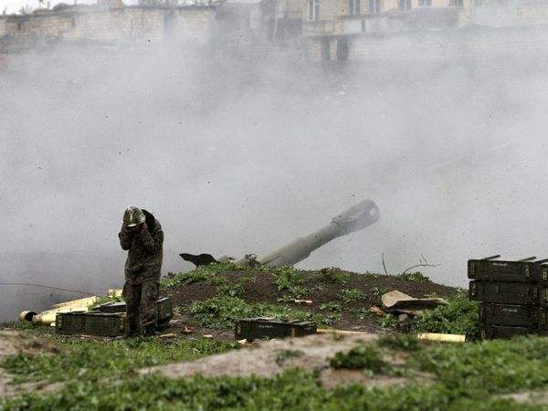 纳卡地区亚美尼亚自卫部队对阿塞拜疆军队目标进行炮击。