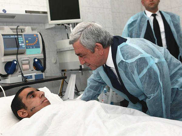 4月4日,亚美尼亚总统萨尔基在首都埃里温中央军医院慰问受伤士兵。