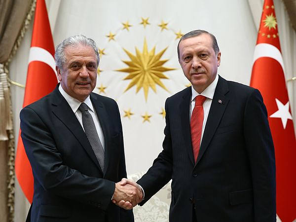 4月4日,土耳其总统埃尔多安(右)与负责移民事务的欧盟委员阿夫拉莫普洛斯举行会谈。