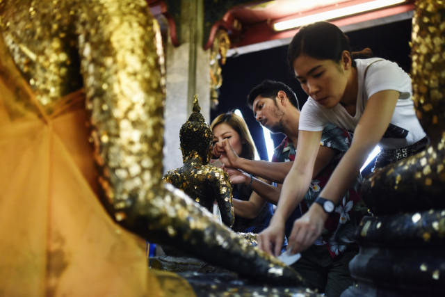 图为2月22日,在泰国曼谷华兰蓬寺,前来庆祝泰国传统佛教节日万佛节的人们为佛像贴金箔。(新华社记者 李芒茫 摄)