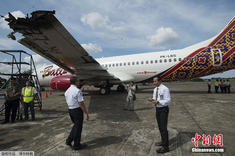 当地时间2016年4月5日,印尼雅加达,两架飞机相撞事故中的巴泽航空的飞机停在停机坪上。4月4日,巴泽航空(Batik Air)公司一架飞机和Transnusa航空的飞机在机场跑道上相撞,其中一客机尾翼被削掉,乘客紧急撤离,事故幸无人死亡。