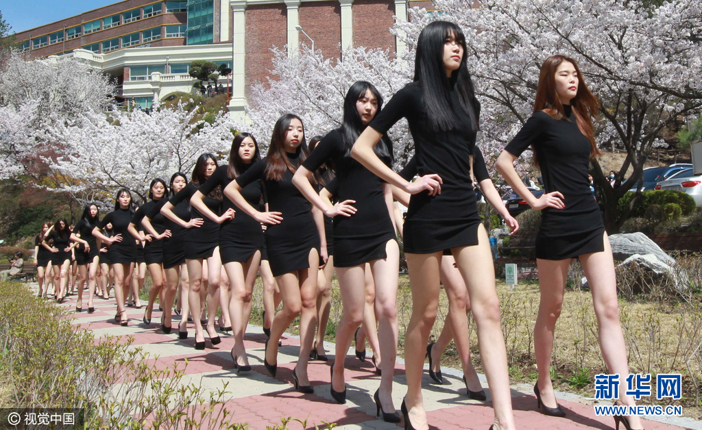 当地时间2016年4月5日,韩国大田,大德大学模特专业的女学生在樱花树下上课,学走台步齐秀大长腿。图片来源:视觉中国