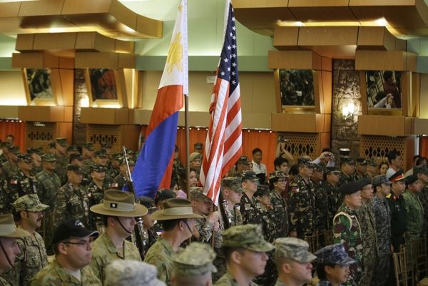 2014年5月5日,在菲律宾马尼拉东北部菲武装部队总部阿吉纳尔多军营拍摄的菲美联合军演开幕式现场。