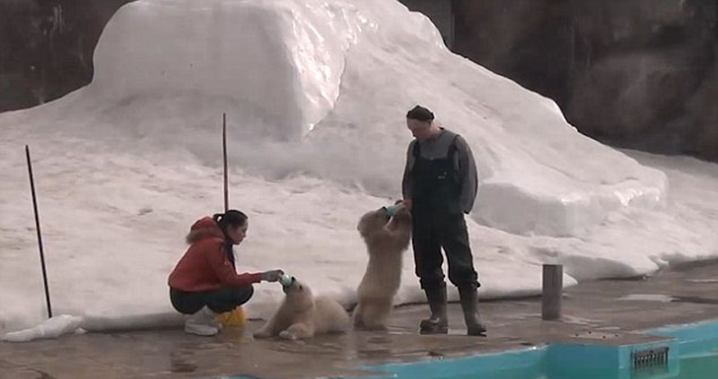 激萌!俄动物园小北极熊抱饲养员大腿撒娇(组图)