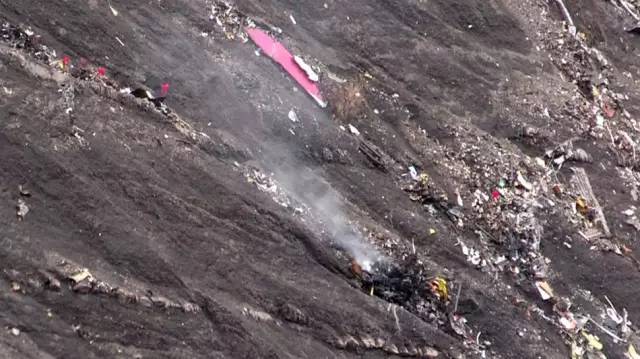 ▲“德国之翼”失事航班残骸散布在阿尔卑斯山山体一侧。