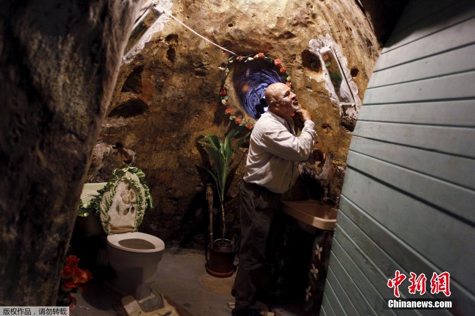 每个房间都通了自来水,卧室都配备了卫生间和淋浴间。老人经常站在他那五彩缤纷的岩石浴室里刮胡子。