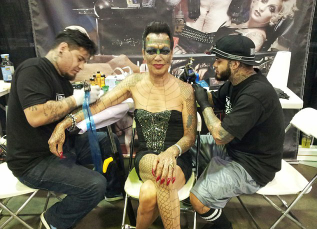 为提高自己与“龙女”的相似度,伊娃不惜将自己的外耳整个割掉,对鼻子也做了相应的调整手术,鼻腔多余的皮肤被割掉,额头植入了犄角填充物,眼球也进行了相应的变色手术,并且面部和身体上也纹满了与爬行动物类似的鳞片。