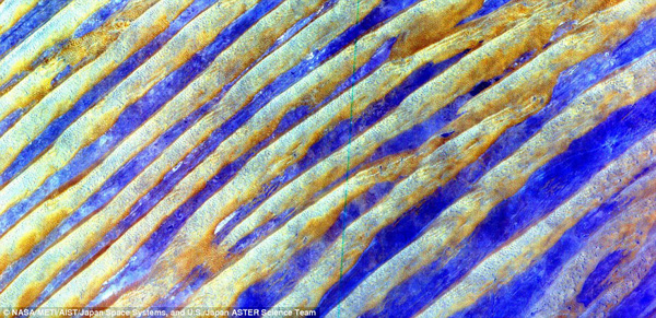 这张照片是Aster于2000年6月25日捕获的,线条表示的是沙特阿拉伯空白之地的鲁卜哈利沙漠线与大海的交接。由于氧化铁矿物的存在沙丘呈黄色,沙丘内部区域呈蓝色是因其粘土和淤泥在波段1有高反射率导致的。