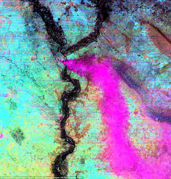 这张照片是Aster于2003年7月14日获得的,显示的是在伊拉克南部的摩苏尔工业硫磺厂发生的火灾。含硫物质的燃烧产生了有害紫色云气体。