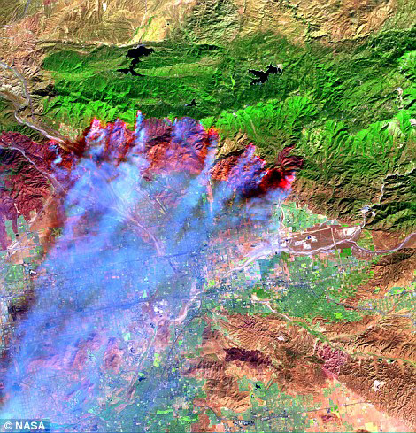 这张图是Aster于2003年在圣贝纳迪诺山15号州际公路两侧附近的狭谷捕获的火灾燃烧图像。其中烟蓝色部分表示的是大火燃烧范围,可以看出已经烧毁超过80000英亩(约49万亩),450所建筑物,至少10辆汽车着火。