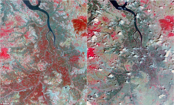 右图显示的是2015年朝鲜遭受的十分严重的旱灾。通过由Aster拍摄的两个图像对比可看出,左图显示的是从2002年就可以很明显地看出干旱破坏了该地的植被(红色所示)。