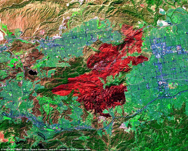 美国加利福尼亚州洛杉矶的灌木丛林发生了一场火灾。超过2.3万英亩(14万亩)的地方被大火(红色所示)覆盖,对圣塔莫尼卡山脉北部的千橡市地区造成巨大威胁,成百上千人被迫撤离家园。