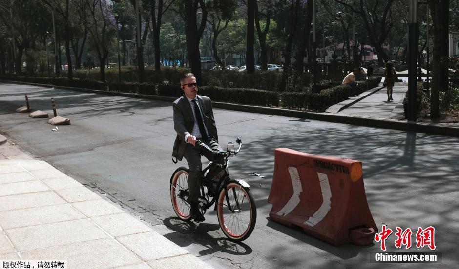 4月7日消息,最近一段时间,墨西哥首都墨西哥城及周边地区空气质量持续不佳。为此,首都墨西哥城及其周边的墨西哥州18个城市于5日起实施“史上最严”的限行政策。4月5日至6月30日,墨西哥城除公共服务用车和新能源汽车外,其他机动车辆全面限行。无论车辆废气检测结果如何,车辆根据车牌尾号,每周都需要限行一天,且每月还要限行一个周六。预计墨西哥城每天将减少100万辆汽车上路,而此前的限行措施每天能限制约80万辆车上路。图为限行措施实施后,一位民众骑车从路上经过。