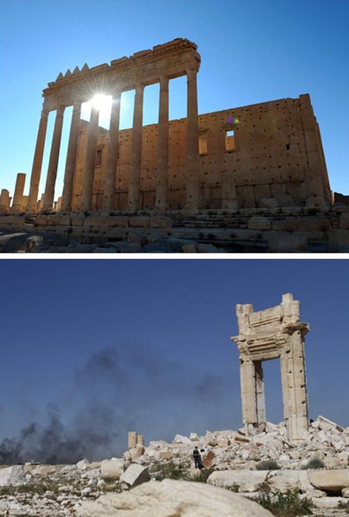 上图: 这是2011年11月9日在巴尔米拉古城遗址拍摄的贝尔神庙。(新华社记者殷博古摄) 下图: 4月1日,在巴尔米拉古城,一名外国记者拍摄被炸毁的贝尔神庙。 (新华社记者杨臻摄)