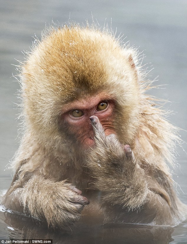 猴子洗澡被打扰的时候也会愤怒吗?据英国《每日邮报》4月7日消息,来自芬兰的野生动物摄影师Jari Peltom ki公布了一张猴子“竖中指”的照片。