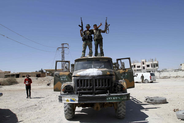 4月4日,经过与极端组织“伊斯兰国”激战,两名叙利亚政府军士兵庆祝收复中部城市盖尔亚廷。 新华社记者杨臻摄