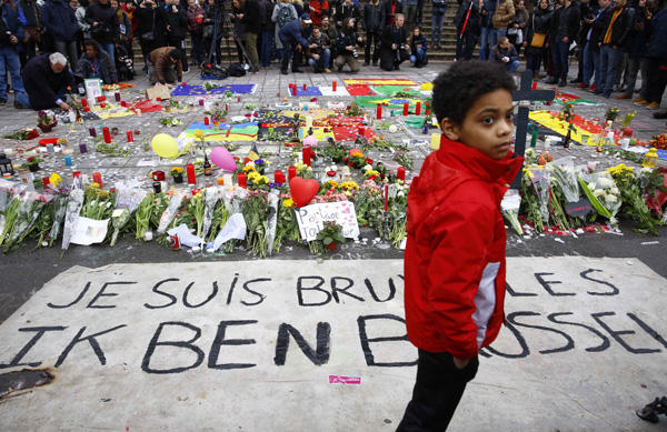 3月23日,数千民众自发聚集在比利时首都布鲁塞尔市中心的股票交易所前,为一天前的恐怖袭击遇难者集体默哀。图为一名小孩站在鲜花和蜡烛前,地上用荷法双语写着“我是布鲁塞尔人”。 新华社记者叶平凡摄