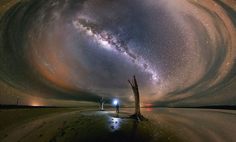 迈克尔是澳大利亚天文摄影师,这组照片拍摄于他在西澳南邦国家公园的盐湖旅行途中。他利用手持式无线远程装置拍摄了这组精彩照片。照片中,迈克尔独自一人身处星空的环绕下,周围一片寂静,平静的湖面映照出璀璨星空,而他手中仿佛有一面发光镜,恰好和明亮的星空融为一体。除了盐湖,迈克尔还分别拍摄了该公园内其他自然景区的星空,包括石灰岩地质区和树群地区,都令人无限遐想。