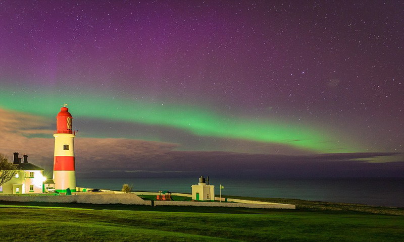 平常所见的极光以绿色为主,而此次出现在桑德兰市的极光主要是由黄色、绿色和紫色三种颜色组成,彷佛夜空中的一道彩虹,加上天空中繁星点点,灯塔区看上去犹如仙境,绚丽无比。