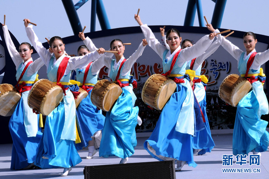 4月8日,韩国民众跳起韩国传统舞蹈庆祝“神秘海路”盛典。新华网记者冮冶摄