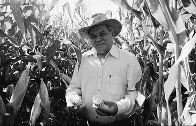 木图农渔集团总经理路易斯·迪维诺在玉米地里查看收成。(颜欢摄)