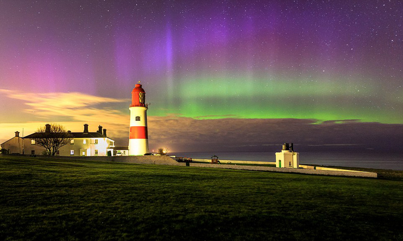 平常所见的极光以绿色为主,而此次出现在桑德兰市的极光主要是由黄色、绿色和紫色三种颜色组成,彷佛夜空中的一道彩虹,加上天空中繁星点点,灯塔区看上去犹如仙境,绚丽无比。(实习编译:张婉君 审稿:李宗泽)