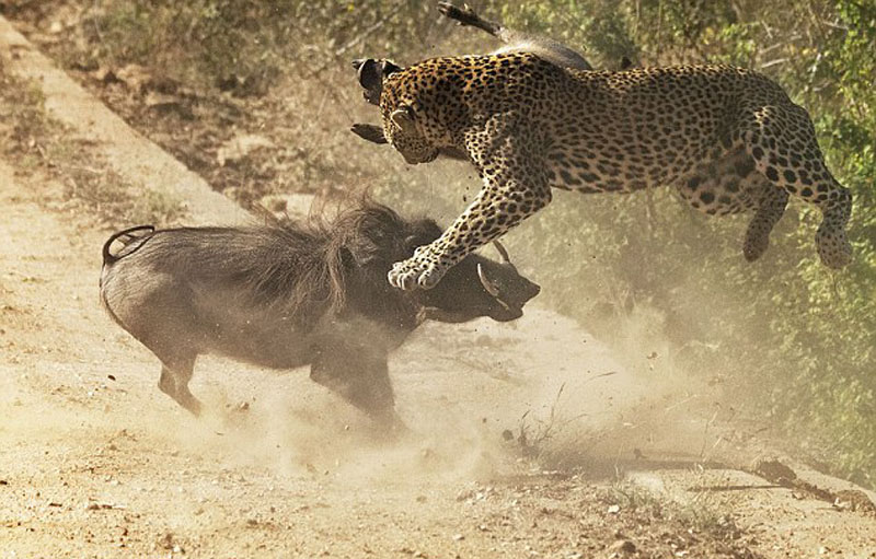 福里说:“花豹突然出现,咬住一头小疣猪的脖子。小疣猪努力挣扎尖叫,试图逃离花豹的大嘴。紧接着,疣猪妈妈从汽车后面急速冲来,用头猛撞花豹的胸腔。当它再次转身冲来,花豹被迫放弃抓到的小疣猪。疣猪妈妈将花豹追入公路旁的涵洞附近,然后转身逃离,花豹向我咆哮。”