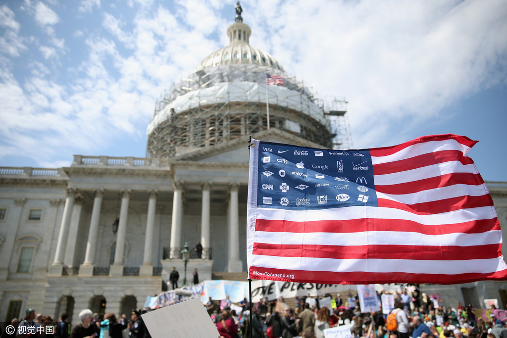 当地时间2016年4月11日,美国华盛顿,活动家聚集国会大厦前静坐,抗议政治广告花费过大。超过2000人参加这个为期10天的游行活动,活动以费城自由钟为起点。