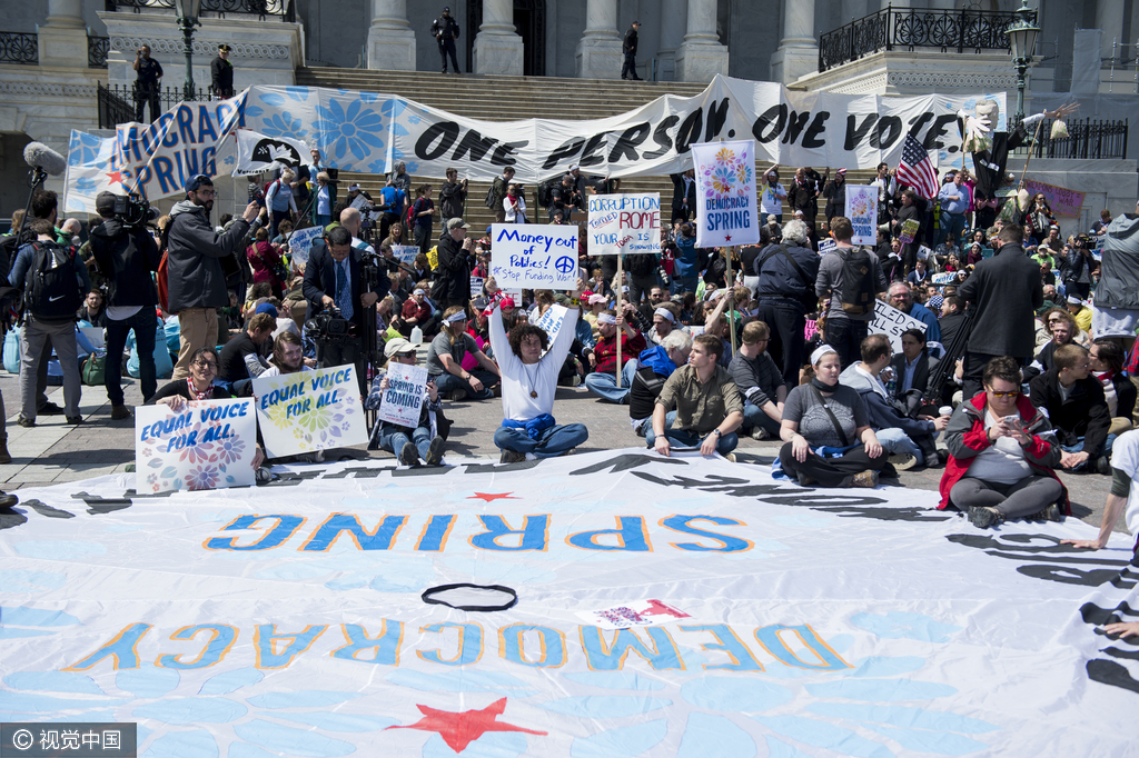 当地时间2016年4月11日,美国华盛顿,活动家聚集国会大厦前静坐,抗议政治广告花费过大。超过2000人参加这个为期10天的游行活动,活动以费城自由钟为起点。