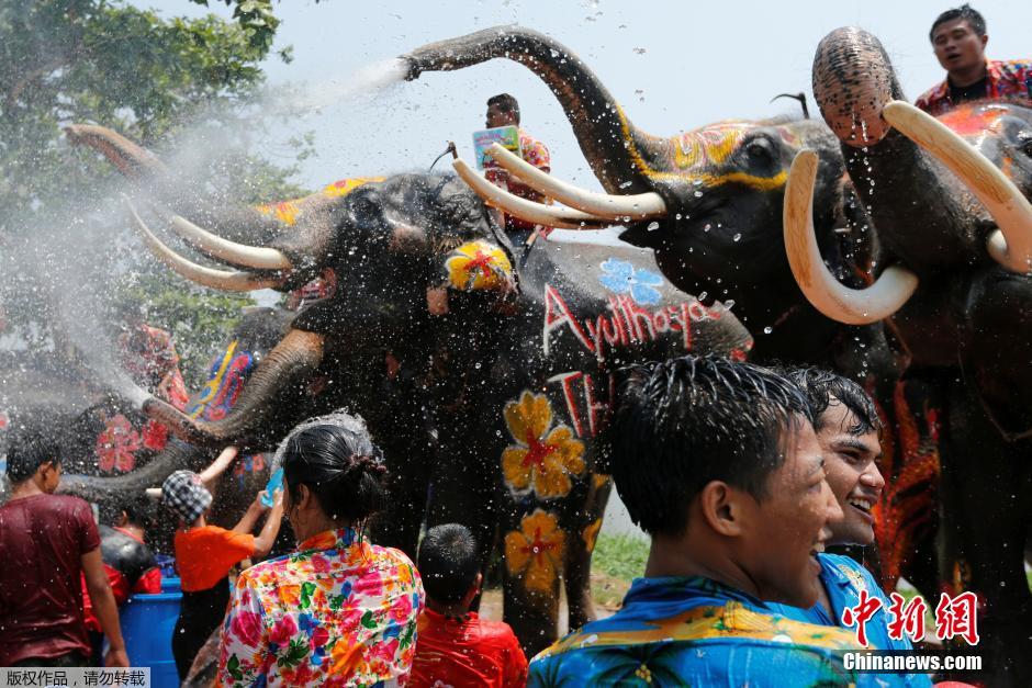 泰国民众庆祝泼水节 大象长鼻秒变“水枪”(组图)